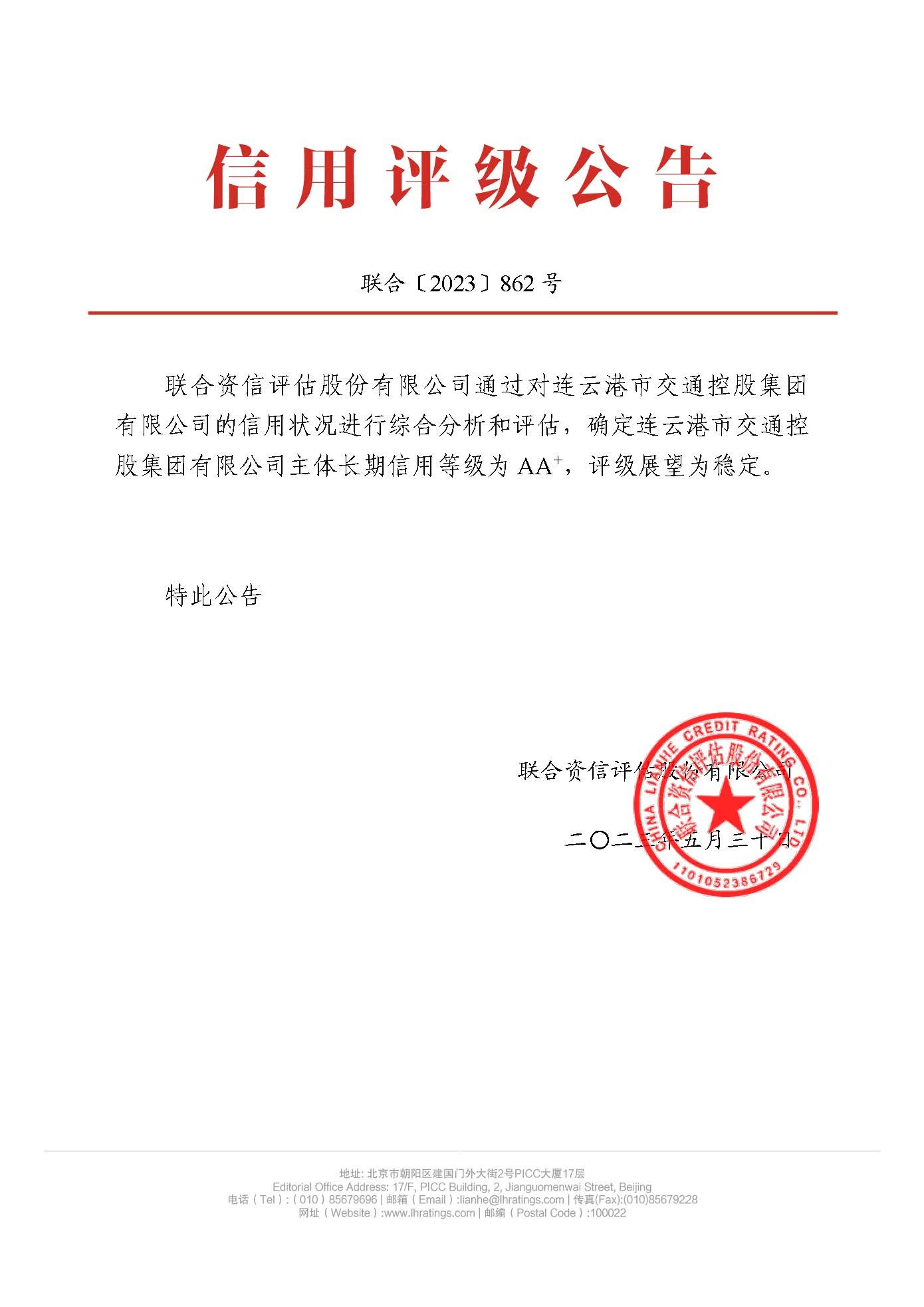 近日,联合资信评估股份有限公司发布信用评级公告,确定半岛足球体育(以下简称“交通控股集团”)主体长期信用等级为AA+,评级展望为稳定。