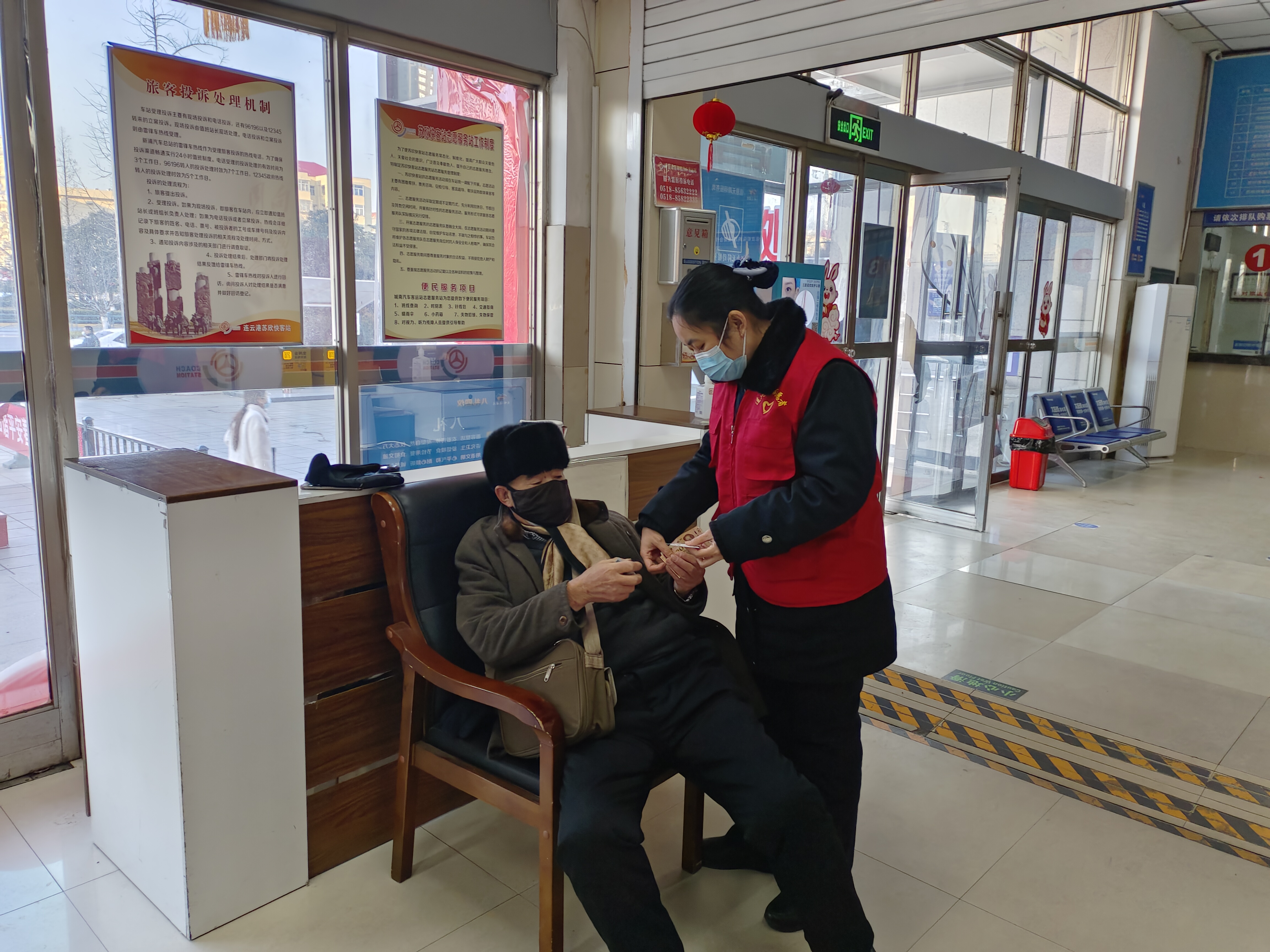 1月17日上午,连汽苏欣站客运员寇静在车站巡视时,发现有一位老人靠在车站门上,无法正常行走。寇静赶紧上前询问并提供帮助,经了解得知,老人患有颈椎病,容易头晕,不能长时间站立或走动。寇静立即搬来座椅让老人坐下,帮忙扶住老人,让老人头靠在椅子后面让他的颈椎有依靠缓解头晕,因为老人浑身无力冒虚汗,寇静及时拿出抽纸给老人擦汗。然后询问老人乘车信息并帮助取票,同时安排老人在候车区休息。检票后,寇静搀扶老人通过绿色通道进站乘车,并与同事王海江一起将老人扶到座椅上。与司机做好沟通,途中注意老人状况,到站后将老人亲手送到家属身边。