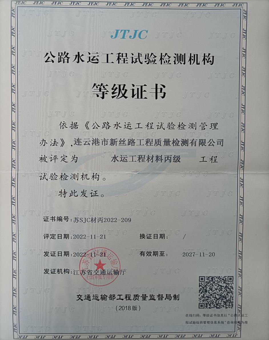 近日,江苏海建新丝路检测公司水运工程材料试验检测资质,经江苏省交通运输厅核准,申报成功并取得证书。