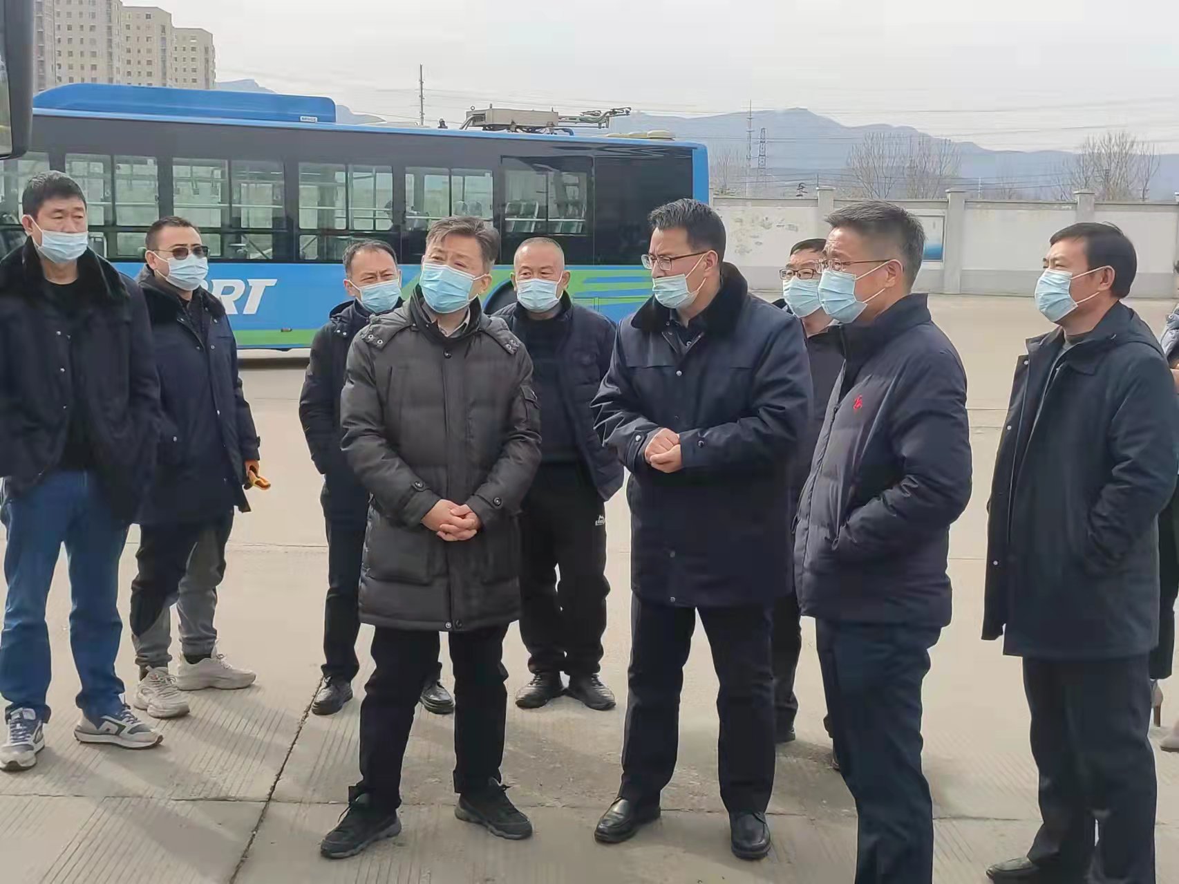 在快速公交东城分公司,许峰一行现场查看了运营车辆的维护保养、消杀通风工作,对集团近期的安全生产及疫情防控工作给予了充分肯定。