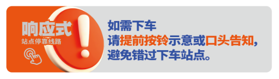 “响应式公交”是指线路不再执行“逢站必停”,车辆到站前,要下车的乘客需提前按铃示意或口头告知驾驶员。如无乘客按铃或口头告知下车,并且停靠站内无乘客等候、无其他公交车停靠时,将减速越站通过。