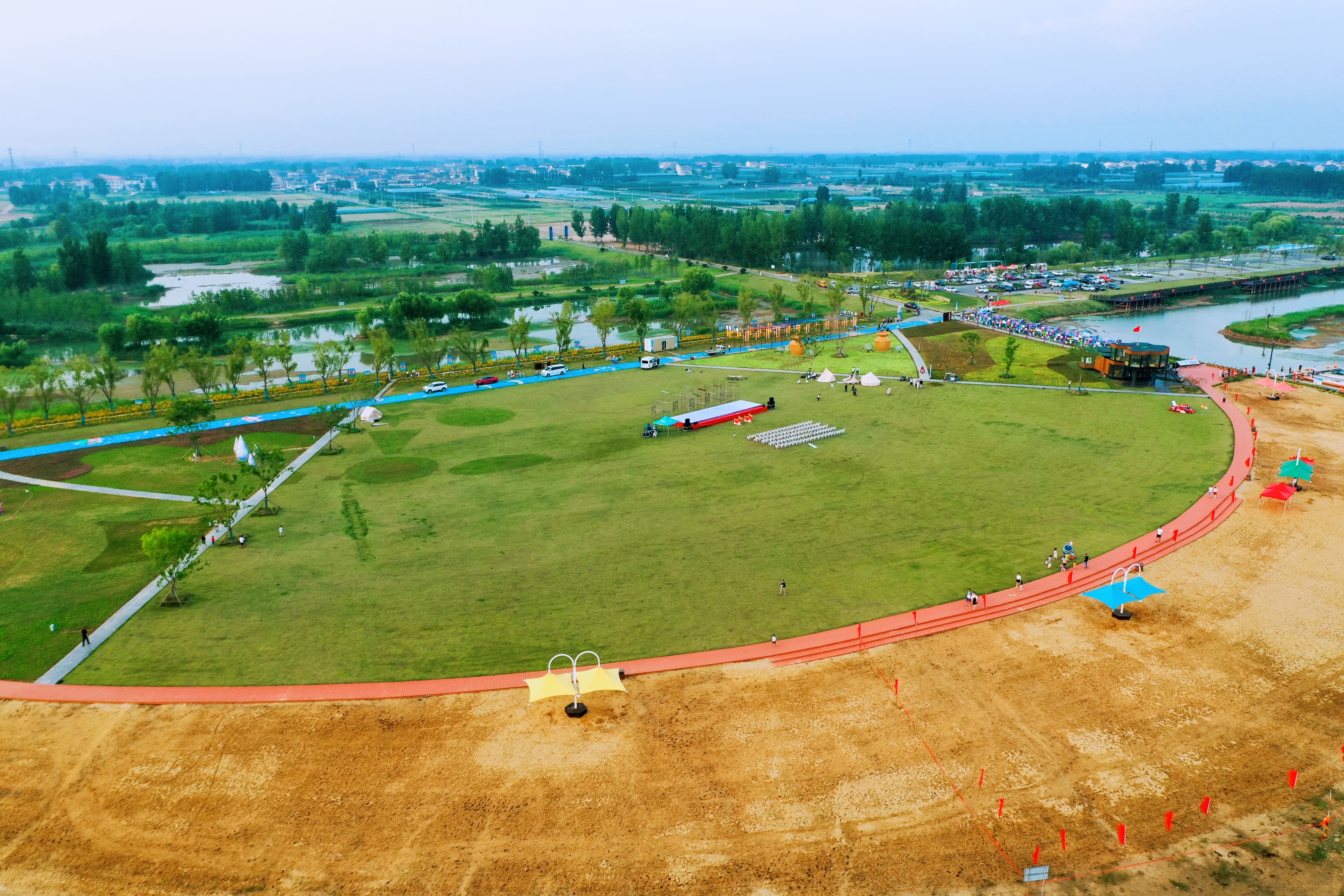 与渔人码头隔水相望,集团打造的石梁河水库生态修复二期工程先导示范点黄金沙滩已与20日完工开园,废弃砂坑航道在生态修复改建下,因地制宜地成为了一处展现沙文化、水文化、库区劳动文化的观光打卡景点。“日月征程”“渔舟芭蕾”等7个主题沙雕各有寓意,“趣味沙世界”“迷你亲子水世界”“月亮湾”等5个主题片区将风光与功能科学搭配,驿站、盥洗室、茅草屋、停车场等服务设施齐备,为湖畔观景游玩提供了无限可能。