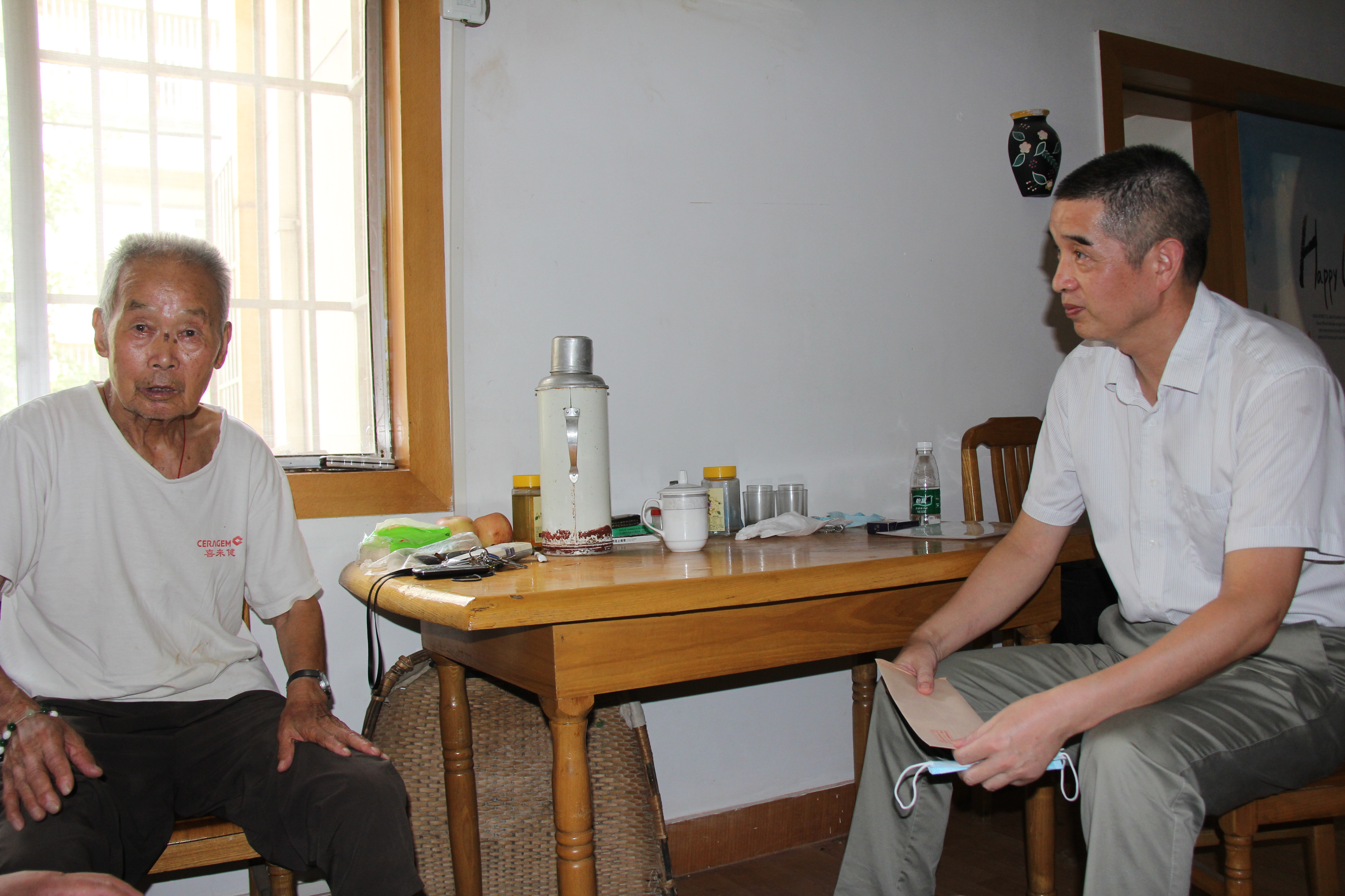 来到周老家,周老及其家人对来访人员分外热情,周老让大家坐下,吩咐家人沏茶。在交谈中,了解到周老已经92岁的高龄了,曾是广州0239部队营参谋长,参加过许许多多大大小小的战役,经历很多生死离别,大家对周老的崇敬之情油然而生。宁宇询问老人身体健康、饮食起居情况,感恩他为祖国、为企业作出的巨大贡献。宁宇还向周老送上了慰问金,叮嘱老人家要保重身体,祝福他身体健康,安享晚年。