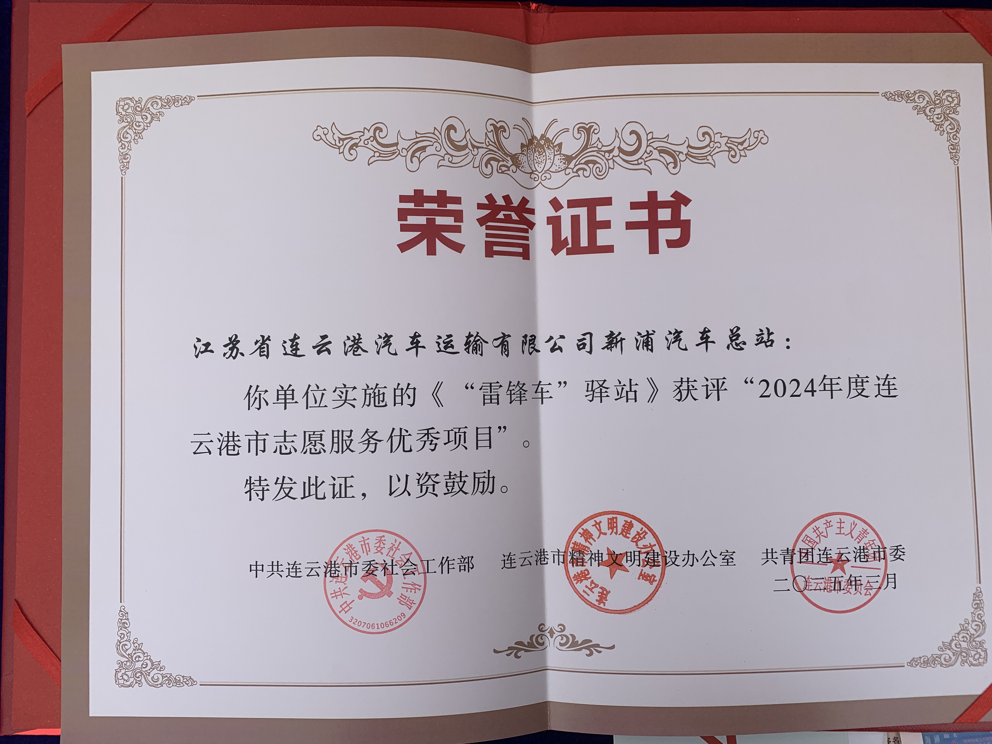 活动现场,新浦汽车总站“雷锋车”驿站荣获2024年度连云港市志愿服务优秀项目称号,成为全场瞩目的焦点。作为连云港市志愿服务的标杆项目,“雷锋车”驿站多年来始终坚持“服务群众、奉献社会”的宗旨,以实际行动践行雷锋精神,赢得了社会各界的广泛赞誉。