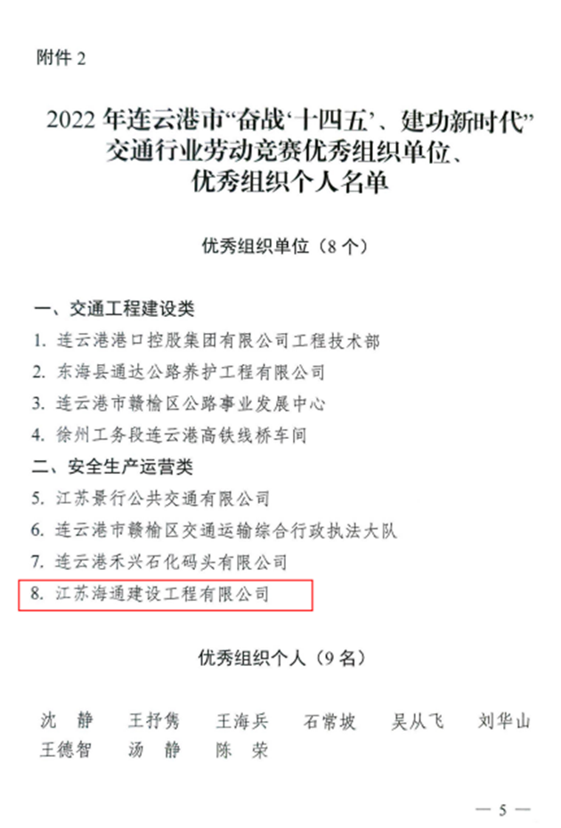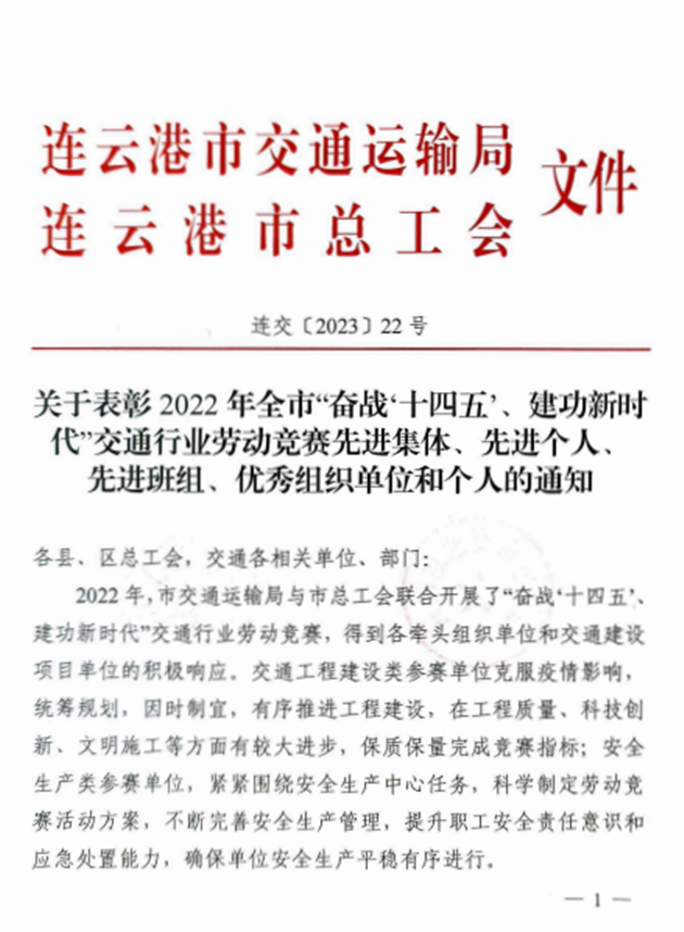 近日,从市总工会、市交通运输局传来喜讯,集团权属公交集团公交事业一部荣获2022年全市“奋战十四五、建功新时代”交通行业劳动竞赛先进集体,海建公司402省道赣榆南环段工程桥梁班组、汽车公司危化品驾驶一班、明茂新能源公司一线运维班组和丰达公司市区养护分公司道路施工项目部四个班组荣获先进班组,公交集团周卓文被评为先进个人,海建公司被评为优秀组织单位。