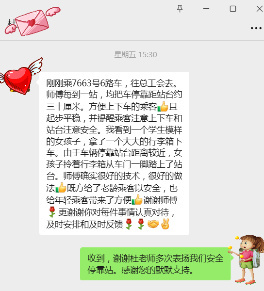 据杜老先生回忆,当天乘车时,他注意到武师傅驾驶的公交车在每个站点停靠时,车身与站台边缘始终保持约30厘米的安全距离。“这个距离刚刚好,我们老年人腿脚不便,抬脚就能轻松上下车,一点不费力。”更让他感动的是,车辆起步前,武师傅总会通过语音温馨提醒:“请乘客们注意脚下安全,带好随身物品。”途中,一位携带大件行李箱的女学生准备下车。由于车辆停靠位置精准,女孩无需费力搬运,直接从车门平稳踏上站台,整个过程顺畅又安全。“师傅的技术真好,这种‘贴台停靠’的做法,既照顾了我们老年人的安全,也给年轻人提供了方便,真是太贴心了!”杜老先生文字中描述到。