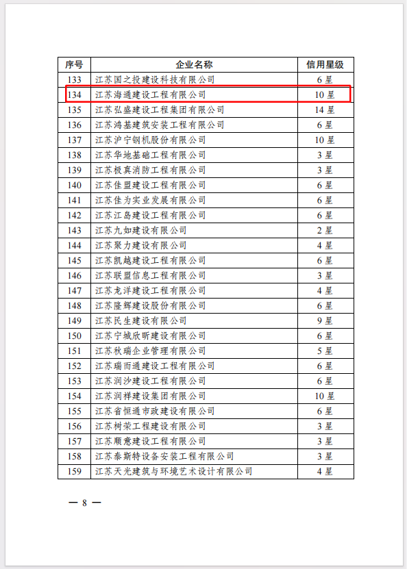 近日,从中国施工企业管理协会(简称“中施企协”)获悉,海建公司入选2024年第六批工程建设企业信用10星级认定名单,较之22年再增2星。