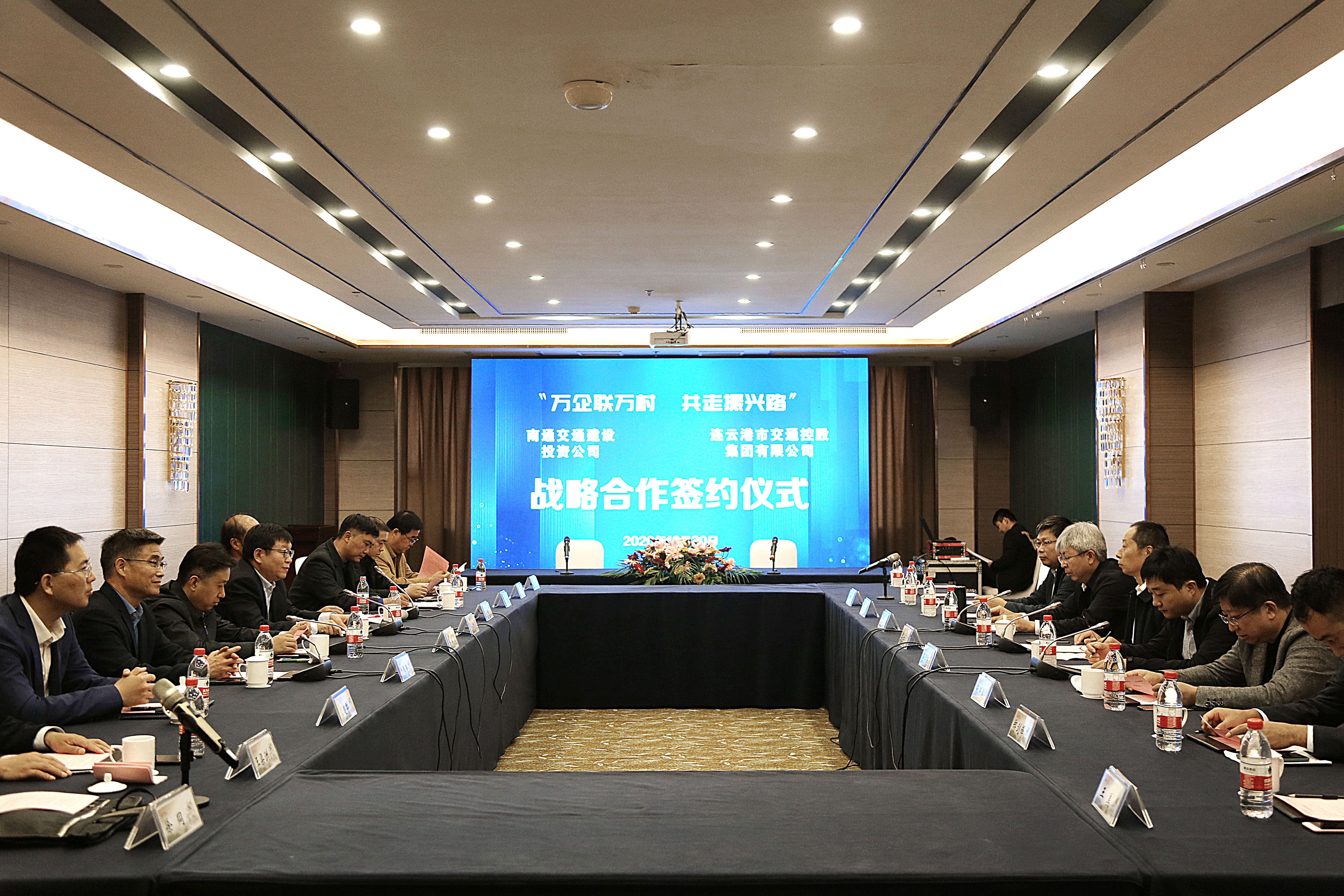 10月30日上午,连云港市交通控股集团和南通交通建设投资公司签订“万企联万村 共走振兴路”合作协议、战略合作协议,连云港市国资委党委委员、副主任许峰;南通市国资委党委委员、主任助理季士军;连云港市交通控股集团董事长、党委书记刘永能,总经理仲伟涛,副总经理孙超;南通交通建设投资公司总经理徐中,党总支副书记张燕滨等参加了签约仪式。